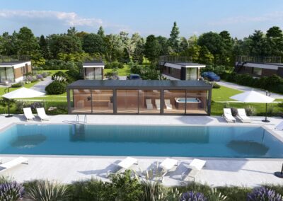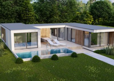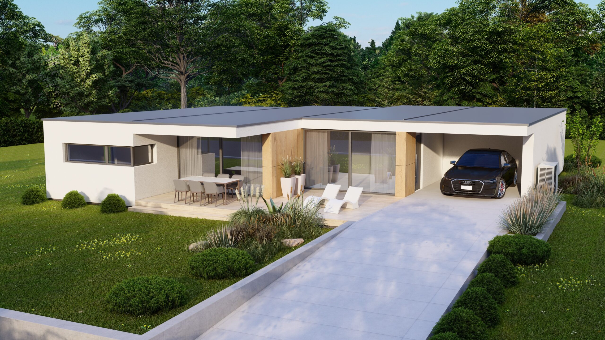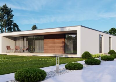 Vario 140 ist ein Familienhaus, das aus drei modularen Einheiten besteht, die vor Ort zusammengebaut werden. Es ist mit wartungsfreien Innenwandverkleidungen, hochwertigen Küchengeräten und Bädern sowie einer Klimaanlage mit Wärmepumpenkühlung ausgestattet. Dieses Modulhaus ist mit einer Grundfläche von 140 m2 in Vier-Jahreszeiten-Ausführung erhältlich, mit Terrassen und Pergola als Extras.